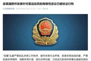 体育资讯04月10日讯 广州市公安局越秀分局今日发布警情通报,针对此前全红婵被网暴事件,对多次发表侮辱性言论的徐某,作出行政拘留10日并处罚款的处罚。