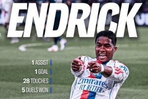 恩德里克上一次为里昂进球还要追溯到一个月前,他在欧联杯1/8决赛首回合中为球队打进绝平进球。此后,恩德里克的进球状态不佳,被法国和西班牙媒体所诟病。如今他在对阵法甲榜首巴黎的比赛中再次证明了自己的实力。